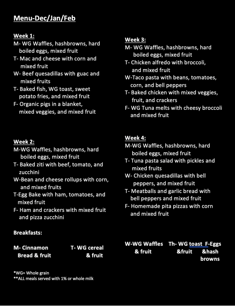 In my care your child will be served quality from scratch meals. I read all nutrition labels to ensure that I only serve the best food. I select organic foods whenever possible. I also check all food labels for common endocrine disruptors, chemical preservatives, GMOs, and other troublesome additives to promote health and wellbeing among my family and the children in my care. I am also a member of the USDA food program which means you can be certain your child is being served proper portions and ratios from each of the food groups at every meal and snack.